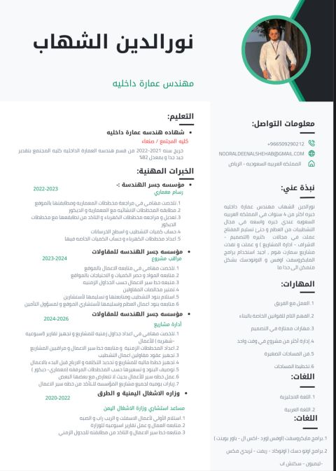 مهندس مدني بخبرة تزيد عن 6 سنوات في إدارة المشاريع، التصميم الانشائي، والاشراف الميداني في مشاريع المباني والبنية التحتية داخل المملكة. عملت في جدة والرياض والليث، ولدي خبرة في التعامل مع الجهات الحكومية، اعداد التقارير الفنية، وإدارة فرق العمل. أجيد استخدام برامج ETABS وSAFE وRobot وRevit، واعداد المخططات التنفيذية، حساب الكميات، ومتابعة الجودة والسلامة. عضو الهيئة السعودية للمهندسين وأسعى لفرصة
