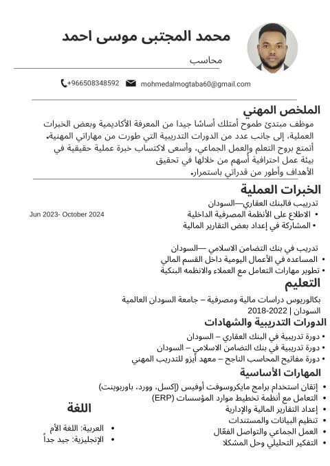 محاسب مبتدئ امتلك أساسا جيدا في المحاسبة وبعض الخبرات العملية، وأتميز بالدقة والتنظيم والقدرة على التعلم السريع. لدي خلفية جيدة في البرامج المحاسبية العربية، وبرامج مايكروسوفت أوفيس (خصوصا اكسل) وأنظمة ERP. أسعى للحصول على فرصة في بيئة عمل احترافية لتطوير خبرتي والمساهمة في تحقيق أهداف المنشأة. متواجد في الرياض - السليمانية