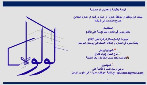 مطلوب مهندس معماري بدرجة محترف للعمل بمكتب استشارات هندسية بشمال الرياض حي الملقا يشترط أن يكون بدرجة محترف ويعمل ببرنامج الريفيت على من تتوافر فيه المواصفات إرسال السيرة الذاتية على البريد الألكتروني الآتي