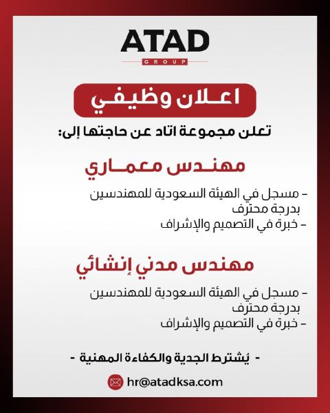 تعلن شركة مقاولات رائدة في الرياض حي الشهداء عن حاجتها الى الشواغر التاليه مهندس كهرباء - مهندس ميكانيكا - بكالوريوس هندسة - خبرة 6 سنوات وما فوق - خبرة بالتصميم ومتابعة التنفيذ للتقديم يرجى إرسال السيرة الذاتية على الايميل أو واتساب مع ذكر المسمى الوظيفي