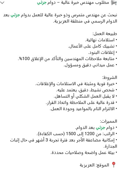 مطلوب مهندس خبرة عالية - دوام جزئي نبحث عن مهندس متمرس وذو خبرة عالية للعمل بدوام جزئي بعد الدوام الرسمي في منطقة الرياض حي العزيزية. طبيعة العمل استلامات نهائية. تشيك كامل على الأعمال. اغلاقات البنود. متابعة ملاحظات المهندسين والتأكد من الاغلاق 100%. عمل ميداني دقيق ومسؤول. الشروط خبرة قوية ومثبتة في الاستلامات والاغلاقات. شخص نشيط، دقيق، يعتمد عليه. لا يقبل العمل الشكلي أو التساهل