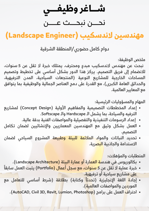 نبحث عن مهندس لاند سكيب مبدع ومحترف في الخالدية، يمتلك خبرة لا تقل عن 5 سنوات، للانضمام الى فريق التصميم. يركز هذا الدور بشكل أساسي على تخطيط وتصميم المساحات الخارجية للمشاريع النوعية (المنتجعات السياحية، المدن الترفيهية، والحدائق العامة الكبرى) مع القدرة على دمج العناصر الجمالية والوظيفية بما يتوافق مع المعايير العالمية. المهام والمسؤوليات الرئيسية اعداد المخططات التصميمية والمفاهيم الأولية (Concept