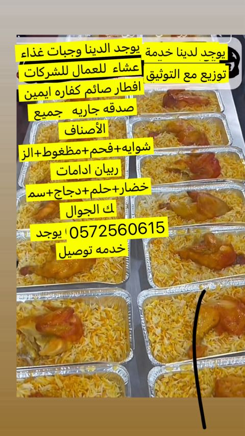 يوجد الدينا وجبات غذاء عشاء للعمال للشركات افطار صائم كفاره أيمين صدقه جاريه جميع الأصناف شواية + فحم + مضغوط + الزربيان ادامات خضار + حلم + دجاج + سمك الجوال يوجد خدمة توصيل