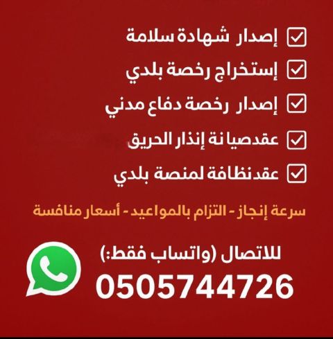 خدماتنا في السلامة والبلدية بأعلى جودة وأقل الأسعار 1 - اصدار شهادة سلامة) 2 - استخراج رخصة بلدي) 3 - اصدار رخصة دفاع مدني) 4 - عقد صيانة لأنظمة انذار الحريق ومشتملاتها) 5 - عقد نظافة لمنصة بلدي) سرعة انجاز - التزام بالمواعيد - أسعار منافسة للتواصل