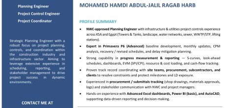 Planning, Follow - up & Project Coordination Engineer with practical experience working within the Project Management Office (PMO) of a major contracting company. Responsible for developing and updating project schedules, tracking progress, issuing periodic reports, and coordinating project requirements to ensure alignment with approved plans. Certified by the National Water Company (NWC) as a Planning