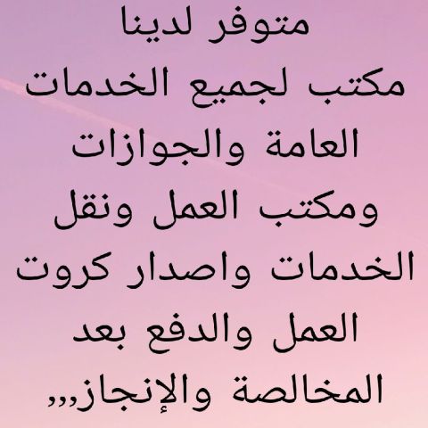 متوفر لدينا مكتب لجميع الخدمات العامة والجوازات ومكتب العمل ونقل الخدمات واصدار كروت العمل والدفع بعد الم خالصة والانجاز