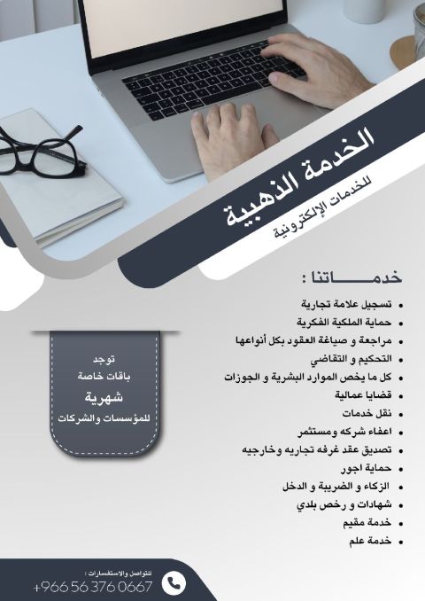 نقدم لكم 1. تسجل علامات تجاريه 2. حماية الملكية الفكرية 3. مراجعة وصياغة العقود 4. كل ما يخص الموارد البشرية والجوازات 5. التحكيم والتقاضي 6. قضايا عمالية 7. نقل عاملات منزليات 8. أعفاء شركة ومستثمر 9. تصديق عقد غرفة تجاريه وخارجيه 10. حماية أجور 11. الزكاء والضريبة والدخل 12. شهادات ورخص بلدي 13. خدمة مقيم 14. خدمة علم 15. تسجيل مستثمر 16. فتح سجلات تجاريه 17. جميع عاملات منزليات بلدي