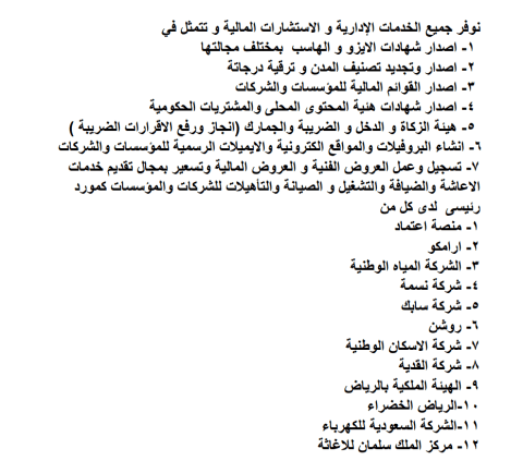 نوفر جميع الخدمات الادارية والاستشارات المالية وتتمثل في 1 - اصدار شهادات الأيزو الهاسب بمختلف مجالتها 2 - اصدار وتجديد تصنيف المدن وترقية درجاتة 3 - اصدار القوائم المالية للمؤسسات والشركات 4 - اصدار شهادات هيئة المحتوى المحلي والمشتريات الحكومية 5 - هيئة الزكاة والدخل والضريبة والجمارك (انجاز ورفع الاقرارات الضريبة) 6 - انشاء البروفيلات والمواقع الكترونية والايميلات الرسمية للمؤسسات والشركات 7