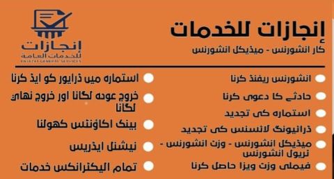 مكتب خدمات عامة متوفر. 1. ازالة ملاحظات مدد 2 اصدار كشف صحي إقامة اصدار إقامة مؤقت 3 تأمين طبي 4 تحديث معلومات جوازين 5. نقل ملكية سجلات تجارية 6 تحويل مؤسسة الى شركة اصدار رخص تجارية