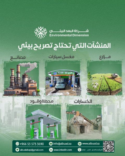 شركة البعد البيئي مكتب استشارات بيئية معتمد من المركز الوطني للرقابة على الالتزام البيئي تقدم خدمات وحلول بيئية تشمل اعداد دراسات تقييم الاثر البيئي - اصدار وتجديد التصاريح البيئية لجميع الأنشطة - خطط الإدارة البيئية - دراسة التدقيق البيئي - خطط الطواري البيئية - تقارير البيئية وخدمات القياس وتحاليل - خطط اعادة تأهيل وعقود النفايات الخطرة (موان) وعقود فلاتر جميع مناطق المملكة