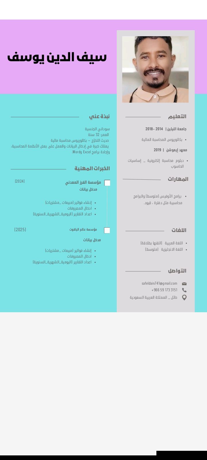 سوداني يبحث عن عمل العمر 32 سنة حديث التخرج - بكالوريوس محاسبة مالية لديه خبرة في ادخال البيانات والعمل على بعض الأنظمة المحاسبية وبرامج وورد واكسل يبحث عن فرصة عمل في المجالات التالية محاسب - كاشير - مدخل بيانات - أعمال مكتبية وخدمات الكترونية - أمين أو مشرف مستودع المتقدم متواجد حاليا في مدينة حائل ولا توجد مشكلة في العمل في أي مدينة أخرى الإقامة سارية وقابلة للنقل بعد التجربة