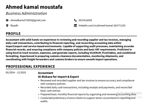محاسب يمني ابحث عن فرصة عمل داخل المملكة. امتلك خبرة عملية منذ نهاية 2022 في الترحيل المحاسبي، التسويات البنكية، اعداد المطابقات، مراجعة الذمم، متابعة المخزون، اعداد نقاط البيع، وتحليل البيانات المالية بدقة، أحمل بكالوريوس محاسبة، وأتقن أنظمة ERP كما عملت كمدرب لأحد الأنظمة متقن Excel، ولدي قدرة على تنظيم العمل وضبط العمليات. جاهز للعمل فورا أتميز بالدقة ومتابعة الاجراءات المحاسبية وتحسينها