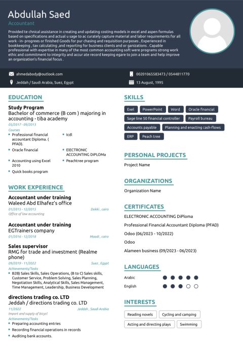 محاسب مصري حاصل على بكالوريوس تجارة خريج عام 2021 جامعة الأزهر 1 - محاسب لدى شركة ابداع مرسوم في تسجيل العمليات المحاسبية باستخدام (ERP) Odoo محاسب لدى شركة اتاسكو للمقاولات العامة القيام بتسجيل القيود اليومية وتسجيل المصروفات والايرادات 2 - محاسب لدى شركة طيبة للتكييف والفلاتر متابعة حسابات العملاء وحسابات الموردين. 3 - الشؤون الاجتماعية متابعة تسجيل بيانات الخاصه بالمستفيدين باستخدام الأكسيل