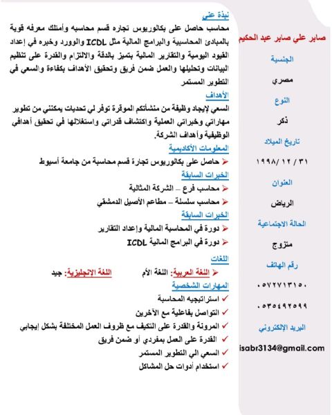 محاسب حديث التخرج يبحث عن فرصة عمل في الرياض خريج بكالوريوس تجارة - قسم المحاسبة 2023 - حديث التخرج وامتلك مهارات قوية في اعداد القيود اليومية، التقارير المالية، والمراجعة الدقيقة للحسابات. اجادة تامة لبرامج مايكروسوفت أوفيس والتعامل مع البرامج المحاسبية، بالاضافة الى اتقان اللغة الانجليزية. أتميز بالدقة، سرعة الانجاز، والقدرة على حل المشكلات واتخاذ القرارات. ابحث عن فرصة عمل مناسبة