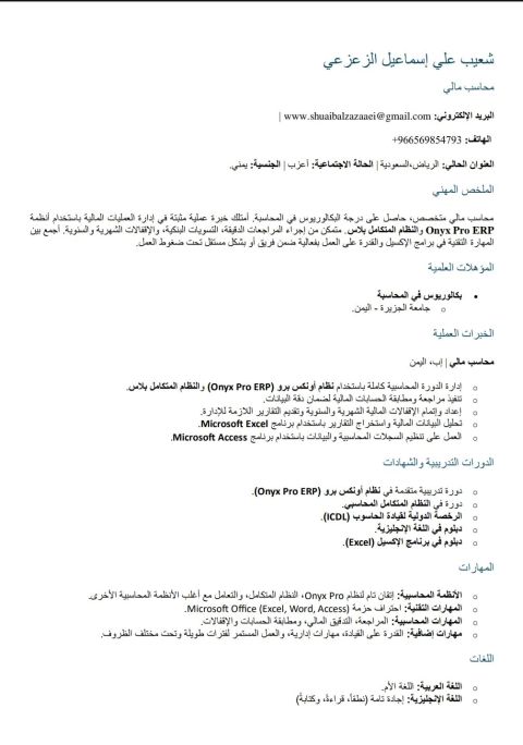 محاسب عام مصري، خبرة 8 سنوات بالمملكة خبرة في اعداد قيود اليومية والمطابقات البنكية والتسويات الشهرية والسنوية ومتابعة ومطابقة حسابات العملاء والموردين واعداد التقارير الشهرية، مطابقة وتصفية العهد والمساعدة في اعداد القوائم المالية واعداد ورفع الاقرارات الضريبية واعداد مسيرات الرواتب ورفعها على مدد خبرة في برنامج Odoo ERP وأغلب برامج ERP SYSTEM إقامة سارية قابلة للنقل ورخصة قيادة سارية