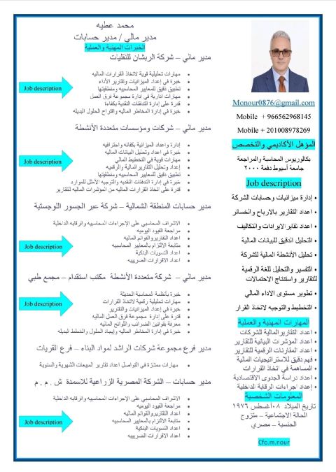مدير مالي محترف ومحاسب قانوني ومتخصص في المجال الطبي خبرة 22 عام ودراسات عليا في المحاسبة مستشار ضريبي وزكوي - دراسات جدوى احترافية Data analyses - CMA Part 1 - CFO SOCPA - IFRS
