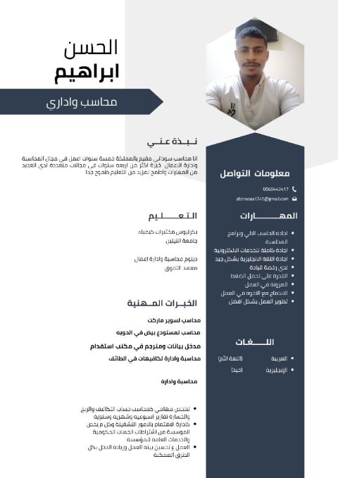 محاسب حديث التخرج ابحث عن عمل في جدة أو الرياض في المحاسبه أو في ادخال البيانات واتمنى تتيح لي الفرصه لأبدع وانمي مهاراتي وشغفي وأحسن عملي في بيئة عملي الجديدة