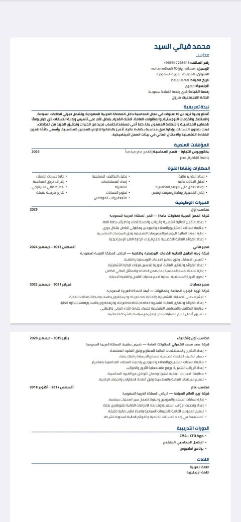 لديه خبرة في العديد من المجالات في مصر فلقد عملت بالمجالات الأتية المحاسبة - الموارد البشرية - المخازن - الادارة اللوجستية (كاشير) دعم عملاء - الاستقبال بالفنادق - التسويق والمبيعات - واعمل محاسب ومشرف كاشير بمطعم في الرياض ببرنامج فودكس ومسوق عقارات ولديه رخصة قيادة والإقامة سارية ومتاح للعمل بأي مكان بالمملكة فورا