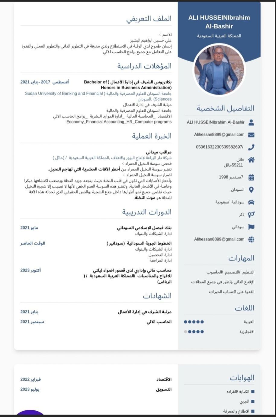 الاسم علي حسين سوداني الجنسية ابحث عن عمل درست بكالوريوس في ادارة أعمال عامة لدي الخبرة في الحاسوب HR وأتحمل ضغط العمل وليس لدي مانع في وقت العمل الخبرة عملت لدى قصر أضواء ليلتي للأفراح والمناسبات (مدير القصر) خبرة سنتين وعملت لدى قصر ذكرى ليلتي للأفراح والمناسبات (سنة) ولدي الخبرة في الاشراف