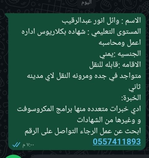الاسم وائل أنور عبدالرقيب المستوى التعليمي شهادة بكالوريوس ادارة اعمل ومحاسبه الجنسية يمني الإقامة قابلة للنقل متواجد في جدة ومرونة النقل لأي مدينة ثاني الخبرة لدي خبرات متعددة منها برامج المكر وسوفت ووغيرها من الشهادات ابحث عن عمل الرجاء التواصل على الرقم ولا مانع أي عمل ثاني