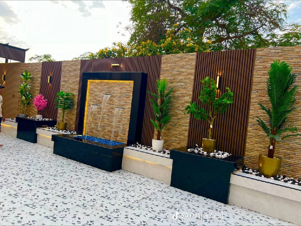 تنسيق حدائق شلال عشب صناعي مظلات نوافير شبكة الري نجيل صناعي