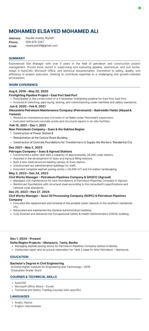 مهندس مدني موجود في السعودية خبرة 6 سنوات في التنفيذ وإدارة المواقع في مشاريع الإنشاءات والبنية التحتية، أعمال الطرق والاسفلت، أعمال اعادة التأهيل والترميم، أعمال العزل والايبوكسيات، لدي خبرة في أعمال الأسيتيل استرا كشر، اجادة تامة لقراءة المخططات وحصر جميع الأعمال وعمل المستخلصات ابحث حاليا عن فرصة عمل مناسبة ضمن شركة محترفة أستطيع من خلالها اضافة قيمة حقيقية للمشروع وتطوير خبراتي المهنية