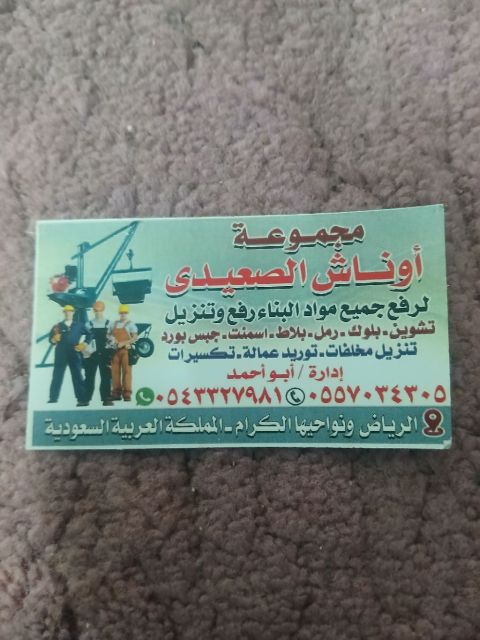 متوفر لدينا رفع جميع مواد البناء وتنزيل المخلفات. وتوريد عماله. وجميع أنوع التكسيرات وقص الجدران والخرسنات وعزال الأسطح والحمامات غيره من ذلك