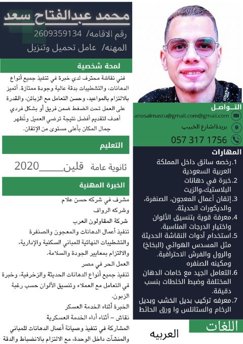 معكم عامر باكستاني ابحث عن عمل أنا معلم تنجيد لدي خبرة تسع سنوات بسعودية وأجيد اللغة العربية