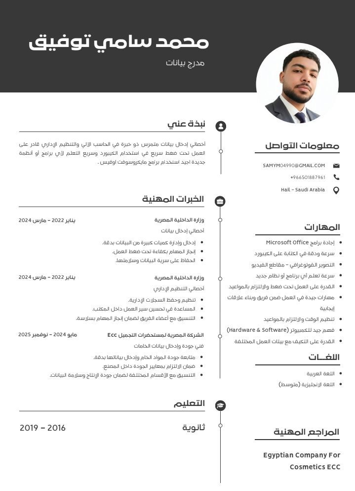 مدخل بيانات وفني جودة مصري (24 سنة) خبرة عامين بوزارة الداخلية المصرية (مدخل بيانات وتنظيم اداري) بشهادات معتمدة من الوزارة. وعملت فني جودة بشركة ECC المصرية لمستحضرات التجميل ومعي شهادة خبرة معتمدة من الشركة. ومحترف بمجموعة Microsoft Office وسريع في تعلم أي شيء جديد علي يخص الشغل على الحاسوب وخبير بصيانة الهاردوير والسوفتوير امتلك الانضباط والدقة في اتمام المهام الادارية والتقنية، وجاهز للعمل فورا