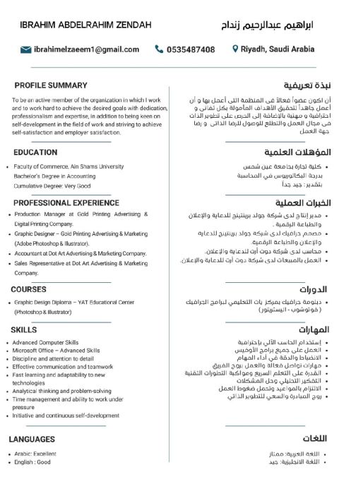 محاسب حديث التخرج تخصص محاسبة ومراجعة مالية، امتلك مهارات قوية في اعداد القيود اليومية والتقارير المالية والتسويات البنكية، تحليل التكاليف والرقابة عليها، اعداد الموازنات التخطيطية وتحليل الانحرافات، والمراجعة الداخلية والخارجية وفق أسس مهنية. ملم بضريبة القيمة المضافة واحتساب ضريبة المدخلات والمخرجات واعداد الاقرار الضريبي. أجيد استخدام Excel ونظام Odoo ERP بكفاءة عالية. جاهز للانضمام فورا