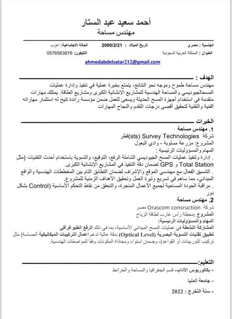 مساح عام وخبرة 5 سنوات في أعمال الانشاءات والبنيه التحتية الصرف الصحي. خريج كلية الآداب قسم الجغرافيا شعبة المساحة والخرائط وايجاده العمل علي برامج (word. AutoCAD. Excel) والتعامل الجيد علي اجهزة المساحة ميزان توتال استيشن وGps وايجاده القيادة