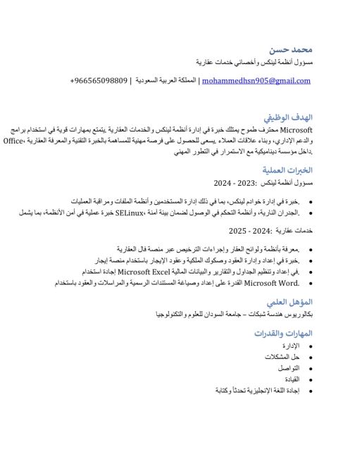 سوداني الجنسية - العمر 31 سنة - بكالوريوس نظم معلومات - محاسب مستخلصات ومدخل بيانات العمل على أنظمة (SOS, AMER, UDS) خبرة 3 سنوات في العقد الموحد للشركة السعودية للكهرباء