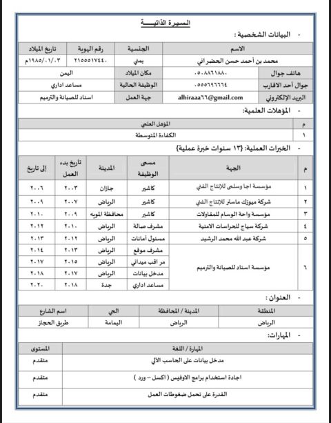 لدي الخبرة الكافية للعمل على المنصات الحكومية مثل ناجز، ابشر، قوي، بلدي، احكام، البورصة العقارية، الضرائب، إيجار، مقيم، مساند، وزارة الموارد البشرية، وأجيد استخدام جميع برامج الحاسب الآلي. لدي اقامة سارية. أستطيع العمل في أي شيء اداري أو مكتبي
