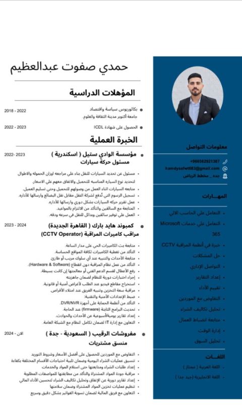 مصري الجنسية بكالوريوس الاقتصاد والعلوم السياسيه مراقب عمال سابقا لدي خبرة في الحسابات والنقليات والتعامل بحترافيه مع الموردين والعملاء والزملاء في العمل وأجيد التعامل علي الورد والأكسيل ولدي القدرة علي تقليل الهدر ووضع الخطط ألتشغليه والوصول الى هدف المنشأة لائق في التحدث مع الأخرين والاقناع وحسن المظهر والتصرف وجاهز للعمل