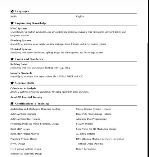 أنا مهندس ميكانيكا حريق وانذار وتكييف وتبريد أو والصيانة أو صرف صحي اشراف وتنفيذ وخبرة من قبل سنتين في مجال الصيانة العامة وخطوط الانتاج وخبرة سنة في مجال التبريد. وتكييف وخبرة سنتين في مجال الانذار والحريق وخبرة ستة شهور في تركيب طاقة شمسية وخبرة ستة شهور في تصميم والصيانة المصاعد الكهربائية وكمان اشتغلت في مجال الاسمرات هوم أتكلم الانجليزية بطلاقة، المؤهل بكالوريوس هندسة ميكانيكية