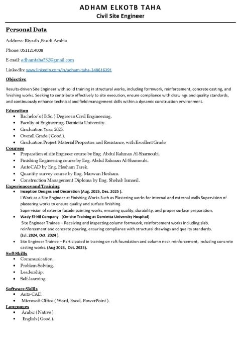 مهندس مدني 2019 باحث عن فرصة عمل مهندس مدني خبرة في أعمال الموقع والبنية التحتية والخرسانة، ابحث عن فرصة عمل مناسبة داخل شركة مقاولات أو مكتب استشاري. الخبرات والمهارات خبرة عملية في مشاريع بنية تحتية، شبكات، خزانات، وأعمال خرسانية الاشراف على التنفيذ بالموقع حصر الكميات ومتابعة المقاولين قراءة اللوحات والتنفيذ طبقا للمواصفات اجادة AutoCAD وExcel الالتزام والدقة وتحمل ضغط العمل