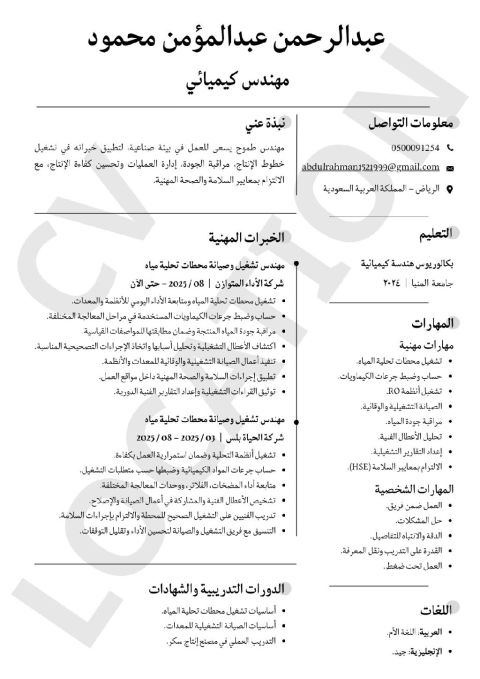 مهندس كيمياء معتمد في الهيئة السعودية للمهندسين، لدي خبرة في معالجة مياه الشرب بمدينة الخرج، ومهندس في انتاج مادة الإثانول كطاقة متجددة، وفي مجال التعدين لدي خبرة في معالجة واستخلاص الذهب، لدي سجل متميز في تحسين الكفاءة ورفع معدل الانتاج، أحمل دورة OSHA في السلامة والصحة المهنية، وشهادة مهنية في تقييم الاثر البيئي مقيم في المملكة، ابحث عن فرصة عمل