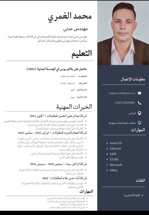 مهندس مدني متخصص في تنفيذ والاشراف على أعمال الخرسانة المسلحة في مختلف المشاريع، بما يشمل الطرق، المباني، الجسور، أنظمة مكافحة الحريق، وأنظمة السباكة. امتلك خبرة في استخدام برنامج AutoCAD. أتمتع بمهارات تواصل ممتازة ومجموعة واسعة من المهارات التقنية، وأفضل العمل ضمن فريق منتج وفعال استلم من المقاولين وأسلم الاستشاريين