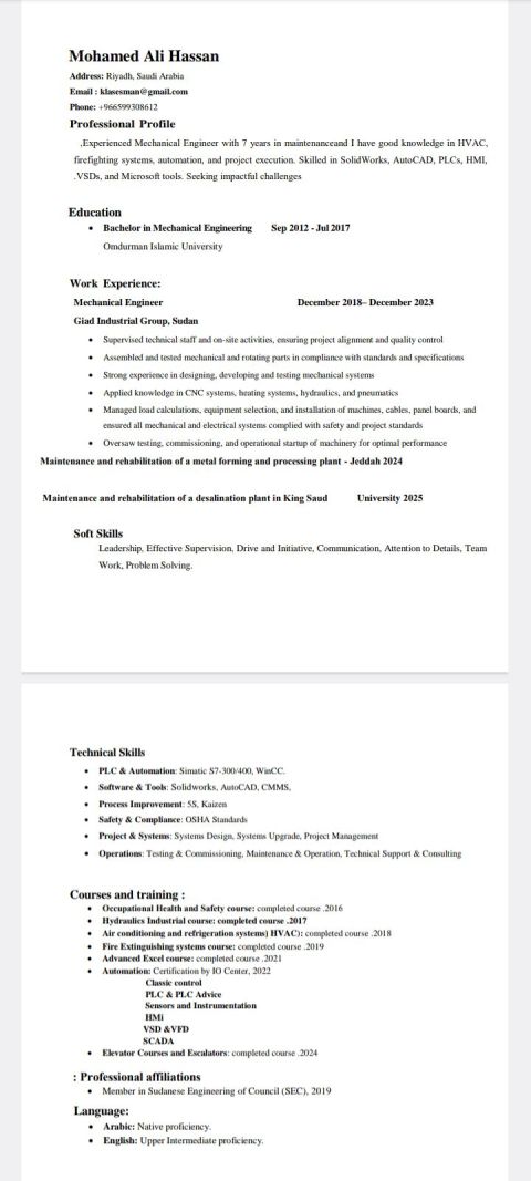Experienced Mechanical Engineer with 7 years in maintenance, and I have good knowledge in HVAC, firefighting systems, automation and project execution. Skilled in SolidWorks, AutoCAD, PLCs, HMI, VSDs, and Microsoft tools. Seeking impactful challenges. Education Bachelor in Mechanical Eng