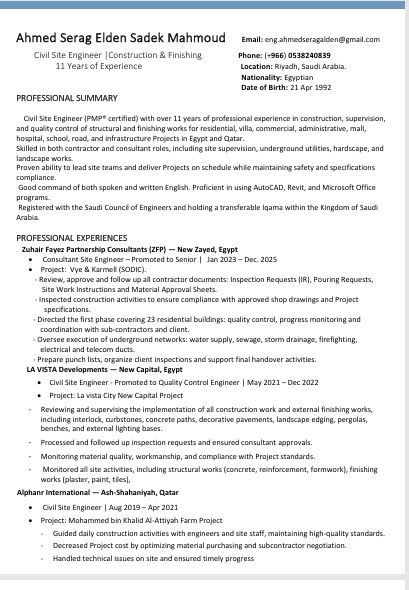 Civil Site Engineer (PMP ® certified) with over 11 years of professional experience in construction, supervision, and quality control of structural and finishing works for residential, villa, commercial, administrative, mall, hospital, school, road, and infrastructure Projects in Egypt and Qatar. Skilled in both contractor and consultant roles, including site supervision, underground utilities, hardscape