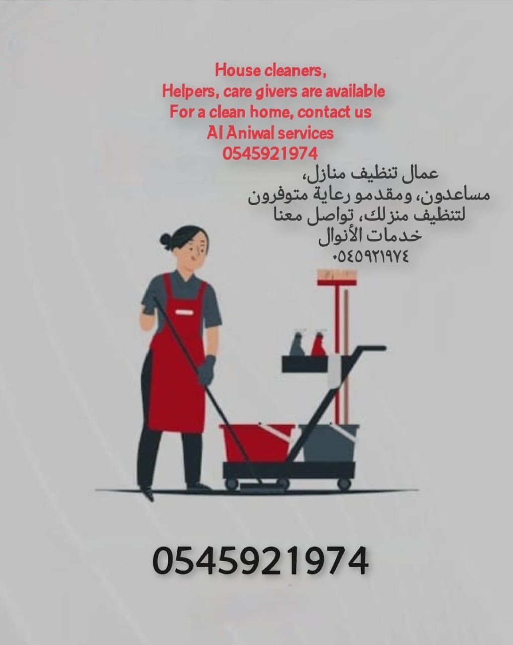 House helpers, cleaners, Nannies, care givers are all available at your door step. All available for both monthly, Weekly, Daily and Hourly. Simply contact us at
