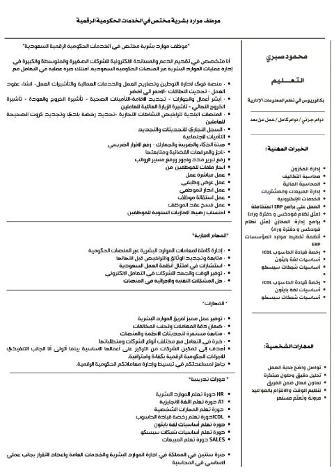 مسؤول موارد بشرية خبرة 5 سنوات شركة صناعات معدنية ومقاولات (حاصل على بكالوريوس تجارة) مصري الجنسية / العمل على جميع المنصات الحكومية المتعلقة بالشركات تجهيز مسيرات الرواتب (سحب بصمة الحضور والانصراف ومايترتب عليها) عمل وثائق التأمين الطبي عمل حسابات الرواتب البنكية متابعة وصيانة سكن العمال متابعة حركة وصيانة المركبات العمل على منصة فسح وسابر للشركات متابعة وصيانة وسائل الدفاع المدني