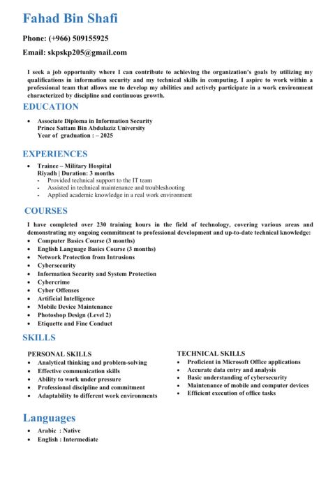 Saudi - Fresh Graduate - Diploma in Cybersecurity Practical training in the IT Department at the Military Hospital Completed Courses English Fundamentals Computer Basics Introduction to Cybersecurity Available to start immediately - Interested in opportunities in IT & Cybersecurity Contact
