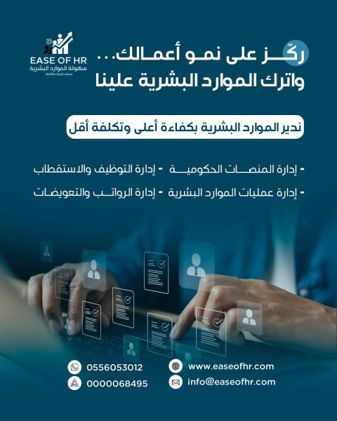 ركز على نمو أعمالك واترك الموارد البشرية علينا نوفر لك خدمة إدارة الموارد البشرية بنظام التشغيل (HR Outsourcing) بدون التزامات توظيف أو تكاليف اضافية خبرة تخصصية أعلى تكاليف أقل من التوظيف الداخلي منصة سعودية موثوقة موثقة من مركز السعودية للأعمال - وزارة التجارة - ومعتمدة لدى وزارة الموارد البشرية تواصل معنا اليوم وابدأ بخدمة HR مدارة بكل احترافية