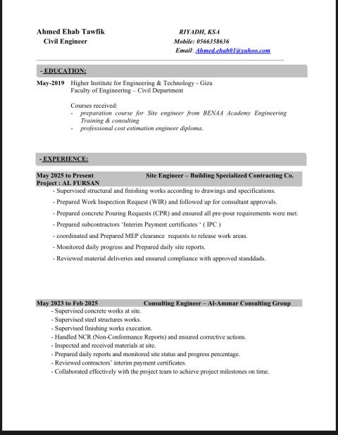 مهندس مدني خبرة 13 سنة كمهندس موقع وكمهندس استشاري مقيم في الرياض عملت علي تنفيذ العديد من المشاريع السكنيه والصحية والتعليميه وأيضا في مجال رصف الطرق الانترلوك والبندورات وأيضا في مجال الصرف الصحي ومجال حواجز ومهديات السيول ابحث عن عن عمل ومستعد للعمل في أي مكان وتحت أي ظروف وفي أي وقت طلب مني ذلك حاصل علي شهادة الهيئة السعودية للمهندسين