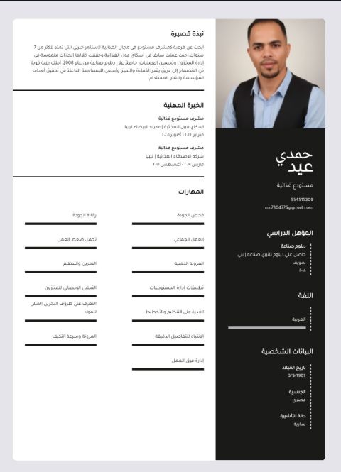 حاصل على شهادة سياحة وفنادق إدارة عامة، موجود حاليا في مكة إقامة سارية شرط نقل كفالة، خبرة في مجال المخبوزات الفرنسية والحلويات اشراف كامل على جميع الأقسام والفروع وايجاد أفكار وحلول جديدة للتطوير واكتساب العملاء الجدد القدرة على الابداع والمشاركة في الأفكار الجديدة، والتواصل مع فريق العمل والمؤسسة، الاستمرارية في التعلم واكتساب الخبرات والمهارات التي تفيد المؤسسة وفريق العمل في انتظار تحدي جديد
