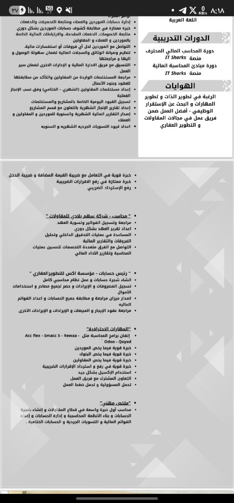ابحث عن عمل محاسب أول خبرة + 4 سنوات في مجال المقاولات والتطوير العقاري مطابقة حسابات الموردين والعملاء والتسويات البنكية والتسويات الجردية والدورة المحاسبية بالكامل والقوائم الماليه والحسابات الختامية ورفع واسترداد الاقرارات الضريبية القدرة على انشاء شجرة حسابات وانشاء نظام محاسبي كامل مهنة عامل إنشاءات متاح نقل كفالة موجود رخصة قيادة وسيارة