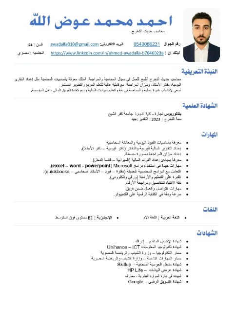 Fresh Graduate Accountant, 24 years old, available for work with sponsorship transfer. Good knowledge of accounting fundamentals and financial principles. Highly proficient in computer usage with familiarity in accounting software. Currently based in KSA. Nationality Egyptian