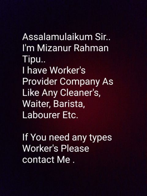 I am Mizanur Rahman Tipu. I have Worker's Provider Company As Like Any Cleaner's Waiter, Barista, Labourer Etc. If you need any types Worker's Please contact Me