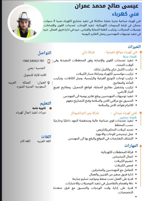فني كهرباء صناعية بخبرة عملية متكامله في تنفيذ مشاريع الكهرباء بخبرة 3 سنوات، متمكن في قراءة الرسومات الكهرب أيه تنفيذ لوحات تمديد القواء والاضاءت توصيلات المحركات وتركيب انضمه الحماية والقياس خبرة في ادارة فريق العمال خبرة في تنفيذ توجيهات المهندسين وعمل التقرير اليومي